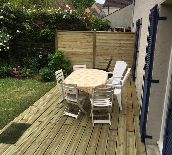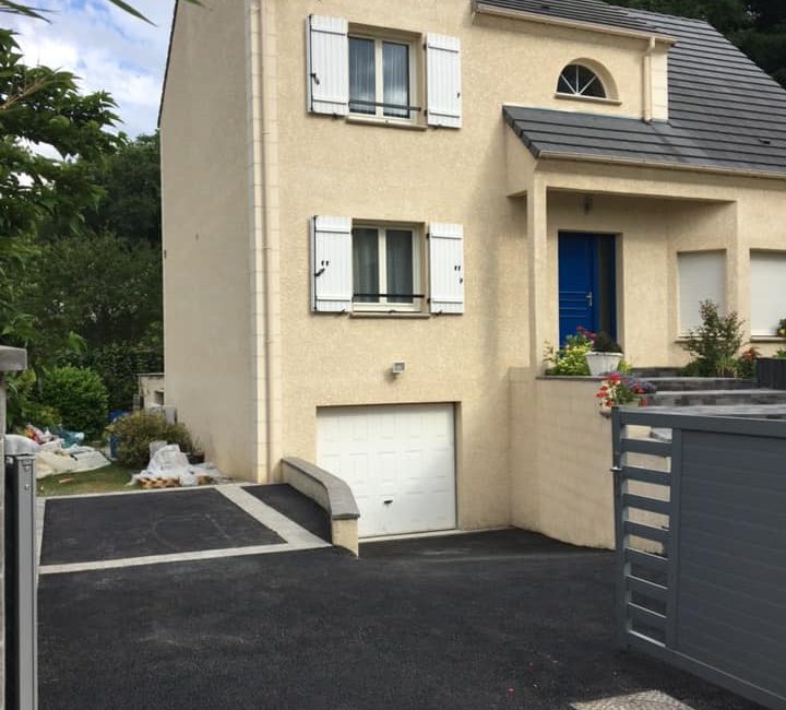 Réalisation sur la commune d’Osny (95): Aménagement extérieur: création terrasses avec pose de dalles, allée en pavés et revêtement enrobé pour les allées carrossables